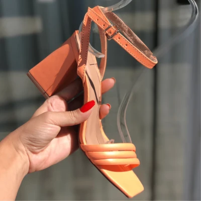Sandália Feminina Laranja Confortavel Salto Grosso 7cm Moda Mulher Sapato Feminino