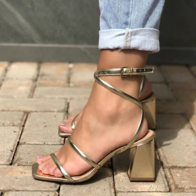 Sandália Feminina Dourada Confortavel Salto Bloco 7 Cm Sapato Feminino Moda Mulher