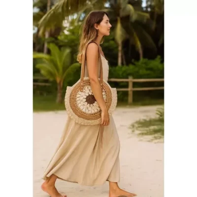 Bolsa de Ombro de Palha Redonda de Verão para Mulheres, Bolsa Tecida à Mão de Vime, Bolsa Grande Feminina